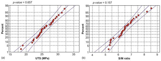 The probability plots (Figure 7) were used to determine whether the data follow the distribution or not. To assess how well the data points follow the distribution, the vertical distance of each point from the fit line was examined. At first, the p-value of each one of the plots suggests that the null hypothesis cannot be rejected, and hence, the data follow the distribution. Furthermore, the data points seem to closely follow the fit line, as seen in Figure 7a,b, which correspond to the UTS and the S/M ratio, accordingly. A number of points pose an exception, one for the UTS and three for the S/M ratio plot, which are more distant compared to the rest of the points. Despite this issue, they are inside the confidence intervals (outer solid lines), a fact that indicates a normal distribution.