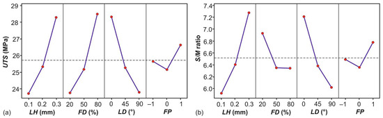 Investigating the main effect plots (Figure 8) revealed the differences between the level means for the four parameters. Figure 8a corresponds to the UTS, whereas Figure 8b represents the mean effect plot for the S/M ratio. By observing Figure 8a, it is evident that the LH acts increasingly on the generated UTS, and especially the 0.3 mm value. It is also clear that a similar pattern applies for the FD. On the other hand, any increase in the LD negatively affects the UTS. Alafaghani et al. [33] concluded that increasing the infill percentage and layer thickness have a strong impact on the tensile strength and stiffness of ABS pieces. Lastly, the FP exhibits a different influence scheme. Specifically, the triangle structure seems to contribute the least to the generated UTS, with the grid being slightly better than the triangles. In contrast, the honeycomb pattern is responsible for more rigid structures and, therefore, for higher UTS values. Tanveer et al. reported similar results for the honeycomb structure [34]. Figure 8b shows that the S/M ratio is affected by both the LH and LD factors, as well as the pattern, in a similar manner to the UTS. Both the 50% and 80% densities produce ratios of approximately equal values. However, the lowest level of density is responsible for increased S/M ratios.