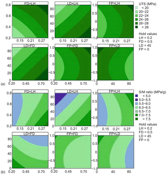 Figure 9a illustrates the relationship between the six different combinations of the input variables and the produced UTS. Similarly, Figure 9b depicts the same interaction for the S/M ratio. Areas with darker colors indicate higher values of the response, whereas lighter colored regions represent lower values. By observing the FD × LH interaction of Figure 9a, for instance, it is seen that LH values close to 0.25 mm, coupled with a density of 80%, or FD values close to 65%, combined with a 0.3 mm layer, produce UTS values higher than 28 MPa. Similar patterns, such as triangles and stripes, are observed for the LD × LH interaction, as well as the LD × FD. The rest of the interactive terms tend to form curved regions. According to Figure 9b, the highest S/M ratios, over 7.5, for the FD × LH interaction are observed in the small triangular area formed by the following combinations: 20% infill and 0.3 mm layer thickness, 20% infill and approximately 0.28 mm LH, and close to 26% FD and 0.3 mm LH.