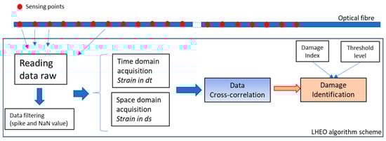 So, in the same way that image processing deals with edge detection by using a specific gradient operator, the edge onset can be detected within a 1D signal. The advantage of using DFOS is its capability of detecting the size and location of damage by means of a very dense sensor array. In detail, the working principle of LHEO stands on acquiring the static strain data of all the sensors along a fibre (space domain) at each instant in time (time domain) and then performing differential operations and a time–space cross-correlation among the data (Figure 1).