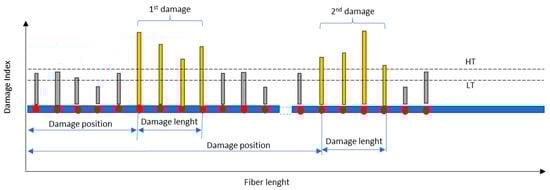 - The threshold levels define the admissible intervals for the elaborated data outcome. In particular, the upper limit of the cross-correlation variance is used to set the highest threshold (HT) limit for the eligible sensors’ dataset, while the mean value of its range is used to set the lower threshold (LT) limit. Readouts below the LT are discarded; readouts between the LT and the HT are kept if a persistency in their appearance is verified; and readouts higher than the HT are considered eligible as indicators of the presence of a potential damage area. The size of the damage, and consequently its location, is determined by the cluster of adjacent sensors whose associated DI values exceed the DI limit (Figure 2).