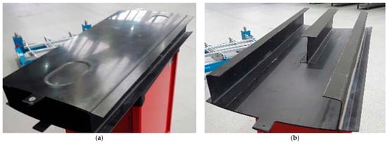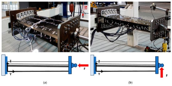 For the experiment, the wingbox section was installed on the test rig at the Piaggio lab and prepared to undergo both compression (Figure 10a) and bending loading tests (Figure 10b). In both cases, the maximum force applied was initially defined as 20 kN. That limit was reached only for the compression tests, while in bending (where much larger strains than in the previous case were expected), it was preferred to use a 20% safety margin, limiting the force to 16 kN. Table 2 reports the test rig equipment used during the tests.