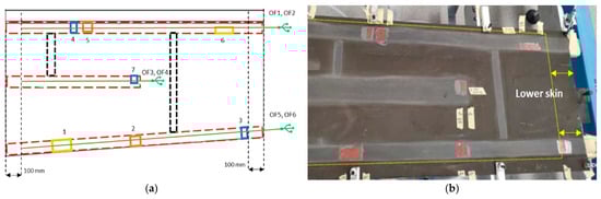 A total of six DFOS were used, each about 1 m long, and installed on the test article, embedded within the bonding lines between the lower skin panel and the corresponding spar caps. For redundancy, in fact, two fibres were deployed for each region of interest to avoid possible data loss during the test process. In Figure 6a, the green lines represent the optical fibres’ positions, while the red lines delimitate the bonding regions between the spar caps and the lower skin. On both sides, a 100 mm distance was implemented to allow for the easy entry and exit of the sensor lines without interfering with the boundary constraints. The installation of two heavy plates aimed at both transferring the load to the extremal sections uniformly and properly being mounted on the test rig. Such plates were drilled to allow the optical fibres to reach the SHM system electronics hardware (f.i., the optical interrogator and the associated PC) and the LHEO algorithm.