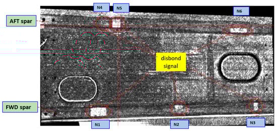 For the sake of completeness, Figure 8 reports the C-scan of the test article after its assembly. It may be of certain relevance to note that the damage area, N7, on the middle spar, was undetected, while the damage areas N4 and N5 seemed partially covered by the adhesive agent. This is probably due to the squeezing of the adhesive paste itself during the assembly of the items. This shows how C-Scan may sometimes, and to a certain extent, fail to detect imperfections in composite structures. This is among the reasons why C-scan is not believed to be a reliable tool with respect to the regulations. In this context, the use of an SHM system could contribute to making its detection capability more reliable.
