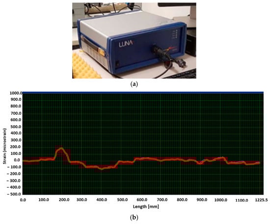 Optical fibre data were logged through the ODISI-B interrogator by LUNA, as shown in Figure 9a. Such a model carries a single channel and is suitable for interrogating one fibre at a time. Therefore, multiple tests were performed to retrieve all the deployed sensors. The space discretization is 5 mm, that is, the gauge length of the distributed fibre, and the default sample rate is 50 Hz, but the results were quasi-static signals.