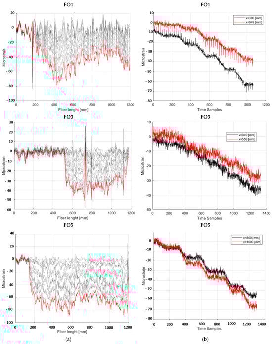 Strain map evolution as a function of the compression load value; (a) strain along a fibre optic, recorded at different instants in time: dash black line represents the strain level acquired at different instants in time while the red line the max strain level; (b) time evolution of strain data, as measured by two selected sensors along the fibre.
