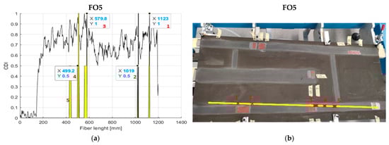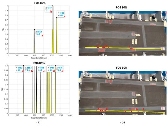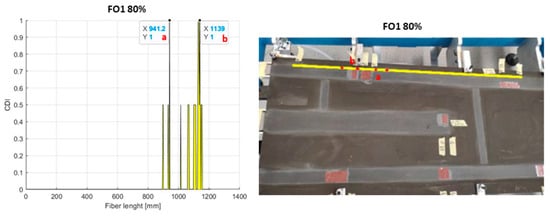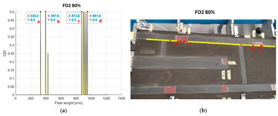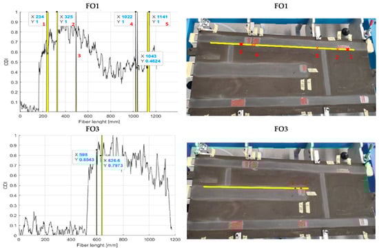 With reference to the rear spar, as shown in Figure 16, the outcomes provided by FO2 seemed to allow for a better prediction of damage presence than what happens for FO1. The second fibre, in fact, showed good evidence of the presence of all the imposed irregularities along the structural region. Instead, FO1 seemed to be insensitive to the structural information. It detected the presence of flaw N6 and detected the flaws N4 and N5 only partially, which is poor when such a result was compared with what was provided by FO2. Because of their proximity, those anomalies were always detected as one in this investigation.
