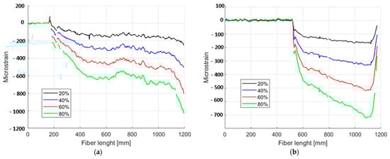 A similar process applied for the compression test was repeated for the bending one. Figure 15 shows the deformation maps during the bending load process along the rear and middle spars, as examples, at five different values of the external force, namely 20%, 40%, 60%, and 80% of the limit load (20 kN). Again, the linearity of the structural response vs. the load values is evident, and the strain profile appears very clear, presenting some peculiar, local high-edge onset, which was then analysed by the SHM algorithm.
