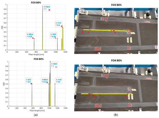 Table 3 summarizes the estimated flaws’ lengths predicted by the LHEO algorithm compared with the nominal ones. Damage presence is generally detected, with some minor, isolated false positives (Figure 13b). The region of accumulation of the detection points seems to be a key indicator of the presence of damage. It is relevant to note that flaws N4 and N5 are indistinguishable because of their proximity, so a global measure was obtained, which was compared with the overall length of both discontinuity areas, including the 20 mm separation. Positive values indicate an overestimate of the anomaly, while minus sign refers to an underestimation. As reported in the bibliography, some previous studies by the same authors [,,] did in fact show that the effect of damage always goes beyond its actual size. In other words, the region where the strain differs with respect to an integral configuration extends over an area larger than its size. This concept is fairly intuitive and was preliminary quantified for specific configurations in the abovementioned manuscripts. Concerning Figure 13, it should be noted that column b shows a simple pictorial representation of the actual fibre layout and is made only for visualization purposes. Due to the tapered view of the wingbox picture, the optical fibre track is seen to follow the spar direction only partially. The red marks over those yellow lines, reported in those same figures, relate to the predicted locations of the damage areas.