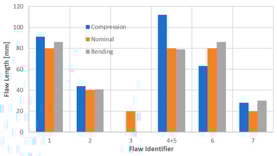It seems convenient to summarise the estimation outcomes in a single graph, as reported below. In Figure 19, the different predictions are compared with the nominal flaw length, i.e., as defined by design. It is just to consider that such a length could have been changed after the manufacturing process, as can be guessed by Figure 8. The compression results are reported on the left bar of each flaw indicator, while the ones related to the bending tests are reported on the right bar. The nominal lengths are centred with respect to the other bars. It can be noted that no element is plotted in correspondence with flaw N3 since it is the sole case for which the data retrieved from both the compression and the bending tests do not allow any prediction to be expressed (damage undetected).