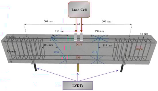For assessing the mechanical properties of the concrete, standard concrete cylinders with dimensions of 150 mm in diameter and 300 mm in height were subjected to compression and splitting strength tests. On the day of testing, the concrete beams’ average compressive and tensile strengths were measured to be 28.0 MPa and 2.70 MPa, respectively. The concrete mix utilized in the experiments contained maximum aggregate particles with a diameter of 16 mm.