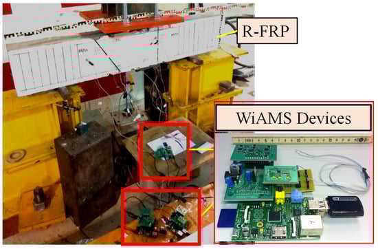 In this experimental study, the selected approach for detecting changes in the installed C-FRP ropes involved the utilization of PZT transducers excited by a sinusoidal harmonic voltage of 2.5 V within a specific frequency range spanning from 10 to 250 kHz, with increments of 1 kHz per step. Serving as both actuators and sensors, the PZT transducers generated the voltage signal and captured the EMI signatures, which were then processed through a custom-designed wireless device known as WiAMS [40,46]. This device is equipped with high processing power, allowing for rapid and extensive calculations, and can be operated remotely, as depicted in Figure 3.