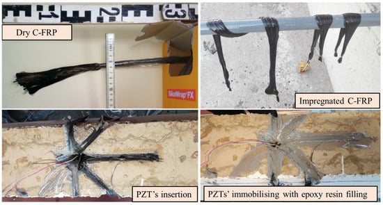 As highlighted above, ensuring the seamless integration of existing structural elements with reinforcing materials presents a multifaceted challenge fraught with uncertainties. Consequently, monitoring the structural integrity of retrofitted structural elements is deemed beneficial for safely extending their service life. Numerous researchers have delved into the realm of Structural Health Monitoring (SHM) techniques applicable to concrete elements [34,35,36]. However, investigations specifically targeting the SHM of fiber-reinforced concrete incorporating dispersed synthetic macrofibers [37,38], FRP composites [39,40,41], and studies focusing on C-FRP-reinforced structural elements are relatively scarce in the literature [42,43,44,45].