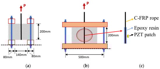 (a,b) Pullout testing configuration; (c) details of the embedded PZTs transducers on C-FRP ropes.