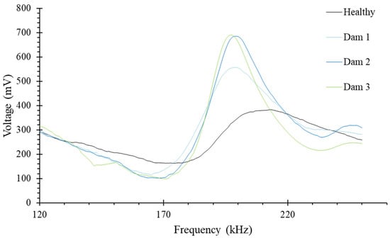 The voltage–frequency diagram corresponding to the pullout test is depicted in Figure 7. In a black continuous line, the response at the pristine condition of the C-FRP rope is depicted and is notated as “Healthy”. Further, in cyan and blue continuous lines, the voltage response measurements at the ascending stage and peak tensile strength are depicted and denoted as “Dam1” and “Dam2”, respectively. Moreover, in the green continuous line, the voltage measurement at the descending post-peak stage is depicted and denoted as “Dam3”. Upon scrutiny of the diagram, discernible deviations were observed in the response curves between the undamaged state and different levels of simulated damage within the frequency range of 120–250 kHz. This observation underscores the sensors’ ability to detect debonding conditions or the failure of the C-FRP ropes. The magnitude of the step change in the overall response of the PZT across the specified frequency range indicated the extent of failure. These deviations in the voltage–frequency diagram provide valuable insights into the structural integrity of the anchorage system and enable the identification of potential bond defects or degradation during the pullout test.