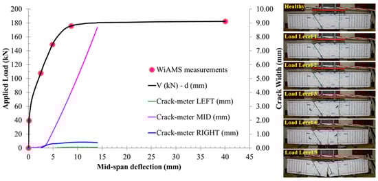Furthermore, this is reflected in the left crack-meter values, where the crack opening was notably reduced compared to that in the right span. Thus, up to that loading level, the rope lost approximately 78% of its total estimated shear strength. These insights shed light on the dynamic interaction between the strengthening elements and the structural behavior, underscoring the importance of thoughtful positioning and design considerations in optimizing performance and resilience against shear-induced failure mechanisms.