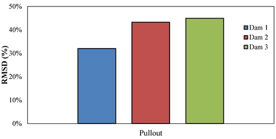 Based on the results obtained from the pullout test and the extracted RMSD index values at specific loading levels until the final fracture of the C-FRP rope (as shown in Figure 9), the evaluation of the residual shear strength bearing capacity was attempted. This evaluation was conducted through a homogenizing approach, which involved correlating the RMSD values of the pullout test with those acquired from the deep beam.