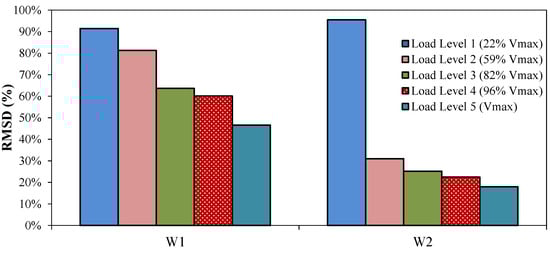 Furthermore, all the RMSD index values obtained from the two bonded PZTs embedded within the through-section ropes were standardized relative to the values obtained from the pullout test. This homogenization process allowed for a direct comparison, and the residual shear strength of ropes W1 and W2, respectively, is illustrated in Figure 11. By aligning the RMSD index values from the PZT-enabled monitoring system with those obtained from the pullout test, valuable insights were gained into the ropes’ residual shear strength and their performance under varying loading conditions.