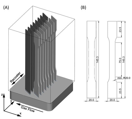 The test specimens were made from AlSi7Mg0.6 alloy powder with a fractional distribution of 20–63 m, supplied by the machine manufacturer, SLM 280 2.0 (SLM Solutions Group AG, Lübeck, Germany). The dog bone flat samples, with a thickness of 1.5 mm and dimensions according to DIN50125-H12.5 × 50, were printed in the vertical orientation, with a remelted powder layer thickness of 30 m. The set of process parameters recommended by the machine supplier was used to produce the samples. Therefore, the material relative density of no less than 99.8% is to be achieved. The total number of samples made per process was 16 pcs (Figure 1). The samples tested in the research were in the as-built condition, i.e., no post-process heat treatment was applied. A complete characterization of the powder used in this study and the material obtained from the PBF-LB/M process can be found in [].