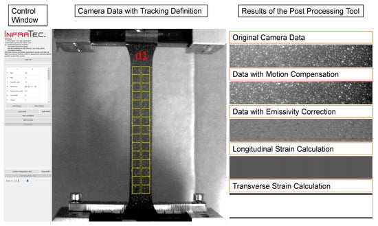 The deformation field was calculated using a post-processing tool from InfraTec. The user interface is shown in Figure 3. To begin the process, the user can define tracker points on a sub-surface for the DIC (Figure 3(d1)). The tool loads the original camera data first. In order to realise the temperature measurement, a motion compensation is implemented and an emissivity correction is performed. These steps eliminate the noise of the temperature signal. The tool uses an affine transformation to calculate the deformations. After processing, the user can choose between the longitudinal strain data in the tension direction and the transverse strain data. For more details about the post-processing tool, see []. In a final step, the result files are generated at defined points or as a mean value of a sub surface. In this paper, the following material curves are created in the midpoint of the detail d1 in Figure 3.