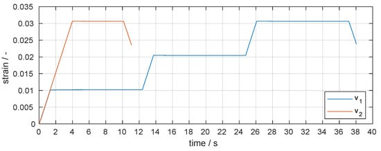 Motivated by the ASTM E328-20 standard [], a modified complex load path was selected for parameter identification, verification, and the resulting optimisation task. In this case, complex means that multiple holding times on different strain levels were integrated in the tensile test. There is an additional unloading path for the verification of the elastic material behaviour. This unloading means that the test ends without destroying the sample. In order to satisfy the assumptions of the thermomechanical approach, a displacement-controlled experiment with a strain rate of was performed. For the validation of the parameters determined by , a second load path is defined. This experiment involves a uniaxial tension to a maximum strain of %, with a following holding time at this strain level of 6 s and a final unloading. The strain rate of is the same as . All experimental characteristics (strain, stress, and temperature evolution) shown in this work are the mean value curves of the six tested samples. A definition of both loading paths is shown in Figure 4.