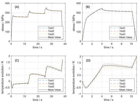 The post-processing tool evaluates the thermomechanical experiments. This involves the local analysis of the material behaviour at the midpoint of the specimen (see detail d1 in Figure 3). Figure 5A,C present the thermomechanical material response for the load path of . The diagrams show three test curves and the mean value curve for a better understanding. For the stress curve and the temperature curve, the standard deviation is and . In the case of the load path , the thermomechanical material response is presented in Figure 5B,D. The standard deviation of the stress curve amounts to and of the temperature curve amounts to . Both test scenarios are finally employed for the optimisation task to determine the parameters of the selected material model.