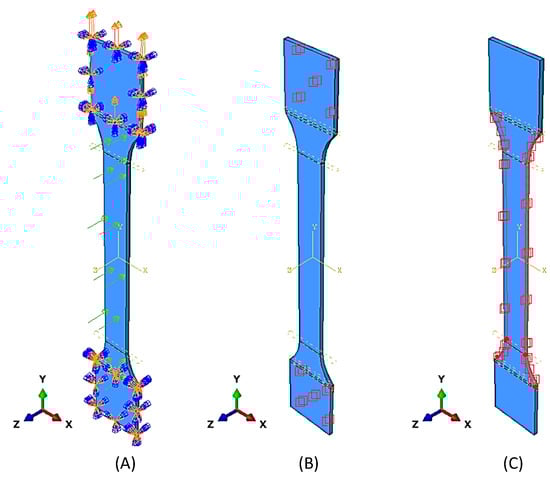 Boundary conditions: (A) displacement boundary conditions and radiator, (B) surface film condition on clamped area, and (C) surface film condition for air convection.