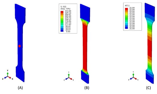 FE−Results at t = 26 s: (A) region of interest, (B) stress distribution in the y-direction, and (C) temperature distribution.