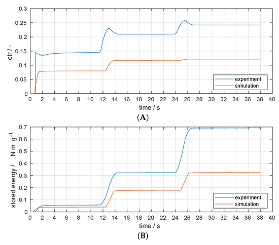 Figure 9 illustrates the error between measured and simulated etr. This error is explained with the help of the stored energy evolution (Figure 9). The reason why there is a difference between the numerical simulation and experiment is that an adiabatic test was not performed. The radiator for the DIC (Figure 2) supplies the system with additional heat energy. This means that the experimentally determined curves show the stored energy, which is influenced by the radiator energy. Figure 9 demonstrates that the modelling of the radiator in the FE model is necessary. In addition, both energy distributions show that the dissipative character of the material is represented in an acceptable way.