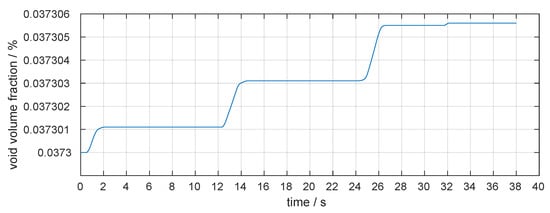 As evidence of material damage, the void volume fraction evolution as a result of the void growing and void nucleation effects is presented in Figure 10. No void coalescence is considered because the void volume fraction is clearly below the coalescence criterion . During elastic deformation, a constant void volume fraction is achieved at the initial porosity . When the inelastic material behaviour begins, an increase in void volume fraction is observed until the start of the holding time at 1.4 s. A small non-linear increase in the void volume fraction follows at the beginning of the holding time, which can be linked to the initiation of relaxation in the stress behaviour (Figure 8). This phenomenon disappears after s and results in a constant void volume fraction value. The behaviour described is repeated until the end of the third holding time and looks plausible according to the rules of the GTN model (Equation (31)). With the unloading process at 32 s, a non-linear increase in void volume fraction is achieved. This phenomenon characterises the residual viscoplasticity, which is caused by the load reversal and reflected in the experimental stress evolution. An elastic behaviour of the material is achieved after the relaxation part, representing a reversible process. As a result of this reversibility, the microstructure is not changed, and the void volume fraction stays constant.