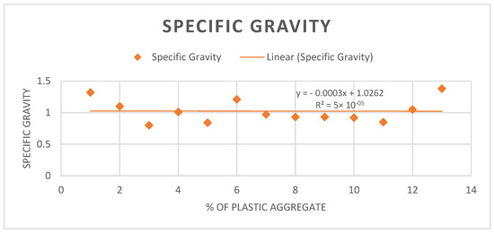 Two previous studies were considered for specific gravity. The specific gravity of the plastic waste has fluctuations in terms of specific gravity values which has been calculated as shown in Figure 2. On this basis, the mean specific gravity has been calculated to be equal to 1.02, the least being 0.8, and the highest being 1.38. The variation in the specific gravity shows that waste materials in different articles have variable densities. The articles indicate that plastic waste is used in various forms such as in other particle sizes and forms of plastic. The equation y = −0.0003x + 1.0262 represents the relationship between percentage of plastic aggregate (x) and the specific gravity of plastic (y).