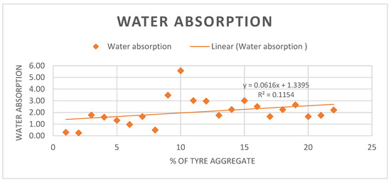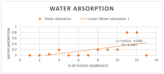 Two studies were considered for water absorption. The research revealed that waste-containing plastic samples were able to absorb 0.18 water, with variations in the degree of 0 to 0.8, as shown in Figure 3. This is due to the poor water absorption characteristic of plastic waste, which enhances the rigidity of concrete. Particle shapes and types of plastics cause water absorption rates to be dissimilar with waste materials. These differences are important to recognize when choosing or combining waste products that will be used to create a concrete mixture [28,29,30,31]. The equation y = 0.00421x − 0.1081 represents the relationship between percentage of plastic aggregate (x) and water absorption of plastic (y).