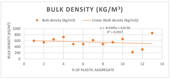 Here too, two previous studies were considered. The average bulk density of waste plastics is 554.6 kg/m3; it varies between 220 and 855 kg/m3, as shown in Figure 4. This is because of the fact that material varies in bulk density because of the plastic waste material particle size. The range observed is caused by various research studies employing different sizes of plastic wastes. Thus, bulk density is an essential factor in determining the concrete properties that influence its mix design. Effective bulk density is another significant characteristic of concrete, as it depends on its performance and durability [29,30].
