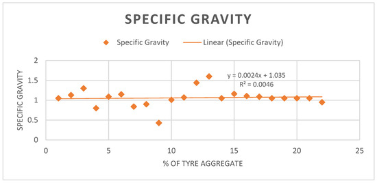 The specific gravity of tyre waste has a mean value of about 1.06, ranging from 0.43 to 1.44, as shown in Figure 5. This variation of specific gravity of tyre waste can be attributed to variation of particle sizes of tyre waste used in concrete mixes by research studies. These differences can be attributed to the various tyre types and the method used in their processing. To concrete performance, specific gravity plays a very vital role. A higher specific gravity represents the particle density; in general, this has an impact on concrete strength and durability [31,32]. The equation y = 0.0024x + 1.035 represents the relationship between the percentage of tyre aggregate (x) and the specific gravity of tyres (y).