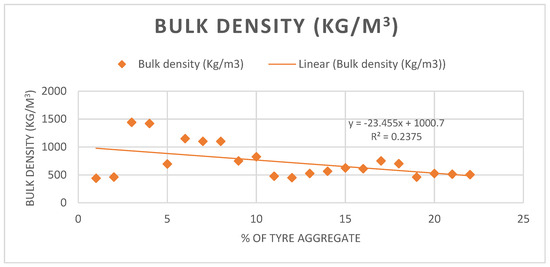 The average bulk density for tyre waste is 730.95 kg/m3, with the values varying between 440 and 1440 kg/m3, as shown in Figure 7. This variation is because of various research studies employing various particle sizes and composition of tyre waste. Particle size distribution of larger tyre waste with lower bulk density value and smaller tyres with increased bulk density values influence concretes characteristics. While using tyre waste in enhancing the performance and properties of concrete that meet non-structural application and sustainability standards, bulk density becomes a critical factor to understand and manage [34,35].