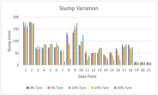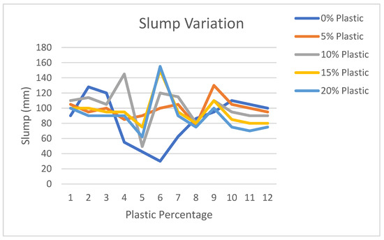 The slump values of plastic integrated concrete vary from 30 mm to 155 mm depending on the percentage of plastic aggregates. Data collections were employed to establish whether it was possible to replace 0% to 20% of plastic. Figure 8. shows that there is no direct relationship between the fluctuation in slump and the fluctuation in plastic percentage. This is due to the fact that different research articles used different grade 20 mix designs in formulating their concrete mix. This graph indicates the relationship between workability and the amount of plastic content. Higher plastic content generally decreases workability, resulting in a lower slump value, which is crucial for understanding the balance between ease of placement and material properties. Concrete can be more or less workable depending on various mix design characteristics—for instance, water content, cement content, and water-cement ratios. Therefore, these observations are supported by that evidence [36,37].