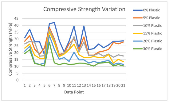 3.3.2. Compressive Strength Variation of Concrete Mixture with Plastic