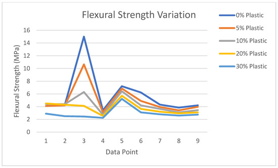 Investigations on the flexural strength trends show that there is a significant reduction in the strength of plastic integrated concrete as the proportion of the plastic concrete rises, as shown in Table 3 and Figure 10. The average flexural strength of the control mix (no plastic) is measured to be 5.89 MPa. However, this value reduces to 2.95 MPa, as the amount of plastic content is increased to 30%. These observations further support the previously made statement on the low bonding capacity of plastic aggregates [39].