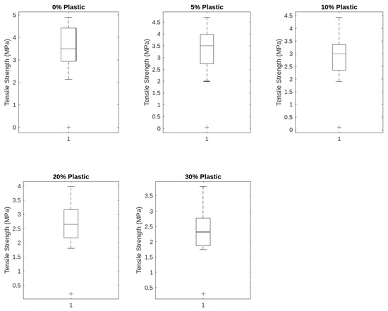 A high percentage of integrated plastic leads to reduced tensile strength of the plastic-integrated concrete. The mean tensile strength of the plastic mixture with no plastic content is 3.72 MPa, and then it lowers to 2.52 MPa when the content of the plastic is raised to 30%, as shown in Table 4 and Figure 11. The increment of plastic aggregate content reduces the tensile properties of concrete [36].