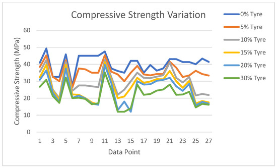 The optimal percentage of tyre aggregate (10%) has been recommended for Grade 30 non-structural concrete that provides better mechanical property benefits and is also environmentally friendly [32,50,51]. The compressive strength of this concrete mix is affirmed at 30.17 MPa, and it is good against vertical loads and pressure; therefore, it is suitable for non-structural applications that do not need high strength.
