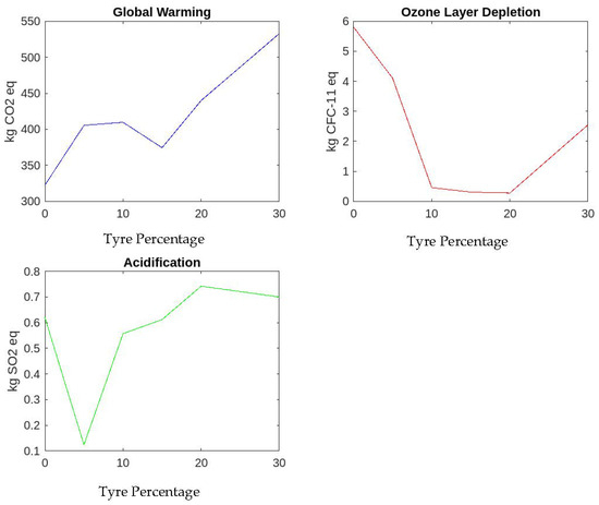 Acidification: Higher tyre rubber share corresponds to higher acidification potential (kg SO2 eq). From the tyre content increase, it can be deduced that the abundance of tyre rubber as a component is directly proportional to the extent of acidification potential and thus leading to enhanced acidification potential. The findings that indicate that rubbers in tires, and their waste management, and disposal processes release acidic gases, thus increasing the degree of acidification in concrete mixtures. It is possible that measures to minimize the impact of acidification along with the addition of tyre rubber may be required [49,51].
