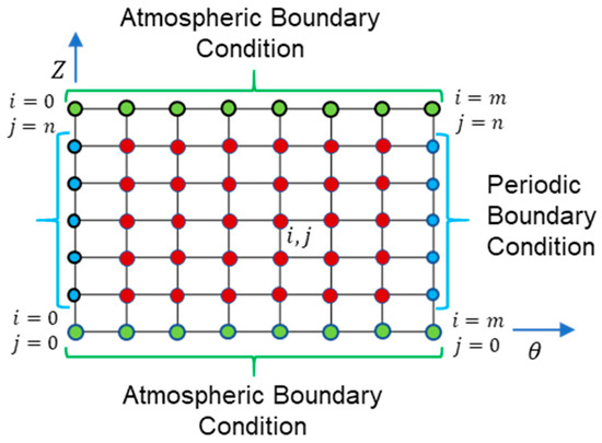 The domain is divided as shown in Figure 2. A system of quadratic equations arises from substituting Equation (12) into the fluid flow domain (red points in Figure 2). In this context, Equation (12) is expanded over the entire flow domain, where the pressure term (independent variable) is of quadratic order. The finite difference method solves this system using adjacent points. The Newton–Raphson method is used to solve the resulting system of quadratic equations.