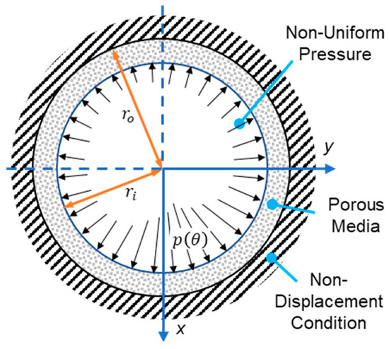 The Airy method is used to calculate the deformation of the porous media, which is considered a hollow cylinder under a non-uniform internal load and non-displacement boundary condition of the external surface (as illustrated in Figure 3). In this case, the axisymmetric solution is not applicable because the non-uniform internal load is not axisymmetric.