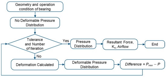 The first step of the solution algorithm procedure is calculating the pressure distribution of the lubricant fluid film considering a non-deformable porous media. Then, the initial deformation is calculated with this non-deformable pressure distribution. This initial deformation determines the new thickness of the lubricant fluid film. With the new thickness, a new fluid pressure distribution is calculated. This pressure value is compared with the previous calculation. The iteration continues until the pressure difference is lower than 1 × 10−6. The resultant force, the static stiffness coefficient, and the airflow consumption are calculated with the pressure distribution obtained in the lubricant fluid film. Figure 4 shows the flowchart of the solution algorithm of the pressure distribution considering the porous media deformation.