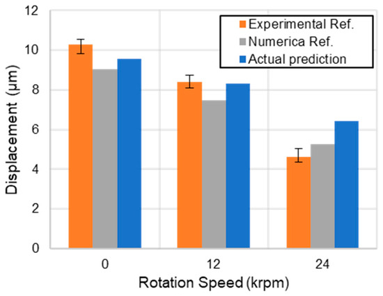 The results of the performance of the proposed algorithm were compared with the results from [36]. Figure 6 shows the displacement (eccentricity) versus the rotational speed, considering the bearing characteristics from Table 1, and at different rotational speeds (Ω), 0, 12,000, and 24,000 rpm. The results of the proposed algorithm show better performance than the numerical solution of reference. The results agree with the experimental result of [36] at zero speed and low rotor speed (0 and 12,000 rpm). However, the result is worse at a higher rotor speed. The lower difference between the experimental and actual prediction is 0.1 μm at 12,000 rpm. The authors of the reference express that the instrument’s characteristics and disposition influence the measurement’s accuracy.