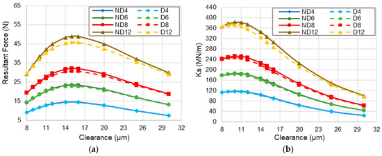 Figure 8 presents the resultant force and static stiffness coefficient considering non-deformable (ND) and deformable (D) porous media. The supply pressure is 4 bar (ND4 and D4), 6 bar (ND6 and D6), 8 bar (ND8 and D8), and 12 bar (ND12 and D12), a clearance from 8 to 30 µm, with an eccentricity ratio () of 0.01, an elastic modulus of 12 × 109 Pa, and no rotational speed. As expected, the resultant force and static stiffness coefficient predictions increase as the supply pressure increases. Figure 8 shows that as the supply pressure increases, the prediction difference of the static stiffness coefficient becomes more evident. The resultant force and stiffness coefficient predictions are lower when considering the porous medium deformation. The clearance of the maximum resultant force, 15 µm, is not affected by either the supply pressure or the consideration of the porous medium deformation, Figure 8a. In the same way, the clearance of the maximum static stiffness coefficient, 10 µm, is not affected by the supply pressure nor by consideration of the porous medium deformation; see Figure 8b.