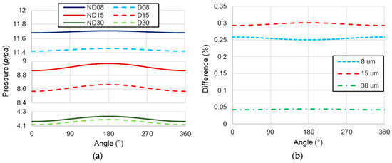 Figure 9 shows the pressure profile and the difference between non-deformable (ND) and deformable (D) porous media at the middle of the bearing length (z = ½ L). The clearance is 8 µm (ND08 and D08), 15 µm (ND 5 and D15), and 30 µm (ND30 and D30). The supply pressure is 12 bar, with an eccentricity ratio () of 0.01, an elastic modulus of 12 × 109 Pa, and no rotational speed. The resultant force is higher at a clearance of 15 µm because the difference between the maximum and minimum value of the profile is higher, in this case 0.104 bar, than in other clearances. Remember that the resultant force is obtained by integrating and balancing the pressure around the circumferential of the porous gas bearing, Equations (3)–(5). The resultant force is reduced because of the decrease in the fluid film pressure, as shown in Figure 9a. This diminution is because the deformation of the porous media affects the pressure balance between the restrictor (porous media) and the gas fluid film.