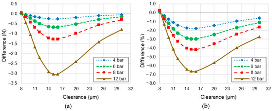 Figure 10 presents the difference in the resultant force and the static stiffness coefficient between non-deformable and deformable porous media predictions. The reference was the non-deformable porous medium prediction. It is confirmed that as the supply pressure increases, the differences between the predictions are higher. This is because the deformation of the porous media is higher. The differences in the resultant force and static stiffness coefficient, at 12 bar, reach a maximum of 3.0 N and 6.6%, respectively. The maximum difference occurs at a clearance of 15.0 μm when the maximum resultant force occurs. After that clearance, the curve tends to zero as the clearance increases; see Figure 10a,b. This trend is identical at all supply pressures. The maximum difference of resultant force at 15.0 μm clearance is because the maximum difference of pressure occurs at that clearance (Figure 9b) and the range of the pressure profile is bigger (Figure 9a). In contrast, the resultant force difference at 8.0 μm is almost depreciable; this is because, although the difference between the pressure profile is high in Figure 9b, the range of the pressure profile is small, at 0.03 bar. This indicates that the form of the pressure profile has a major influence on the resultant force.