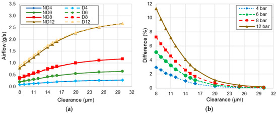 Concerning the airflow, Figure 11 presents the prediction and the difference in airflow consumption considering non-deformable (ND) and deformable (D) porous media. The supply pressure is 4 bar (ND4 and D4), 6 bar (ND6 and D6), 8 bar (ND8 and D8), and 12 bar (ND12 and D12), the clearance is 8 to 30 µm, and the eccentricity ratio is 0.01. Figure 11a shows a slight difference between the airflow prediction considering a non-deformable and deformable porous media. The predictions are higher when considering a deformable porous media. The difference in the airflow predictions is because of the decrease in the pressure in the fluid film, which affects the quadratic difference with the supply pressure in Darcy’s law. Figure 11b shows that the difference in airflow predictions increases while the clearance decreases. This trend is similar in all supply pressures. The maximum difference was 11.3% at a supply pressure of 12 bar at a clearance of approximately 8.0 μm. In contrast with the resultant force, the maximum proportional airflow difference occurs at 8 μm because the difference between the pressure profile is high (Figure 9b) and the airflow at that clearance is low (Figure 11a).