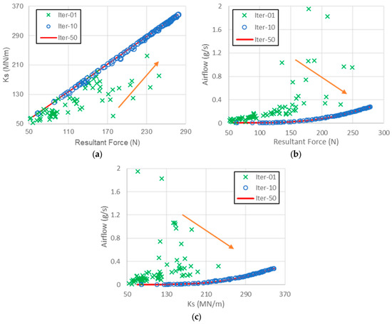 Figure 12 shows the progress of the algorithm’s search for the optimal solutions of the objectives: resultant force vs. static stiffness coefficient, resultant force vs. airflow, and static stiffness coefficient vs. airflow. The iterations start randomly, as shown in Figure 12. The fast convergence of the solution algorithm for the optimal Pareto front is evident. At the same time, it shows the trend by optimizing the objectives, maximizing the resultant force and static stiffness coefficient, and minimizing the airflow (orange arrow). At a lower number of ten iterations, the Pareto front solution is almost as converged as the Pareto front for iteration fifty.